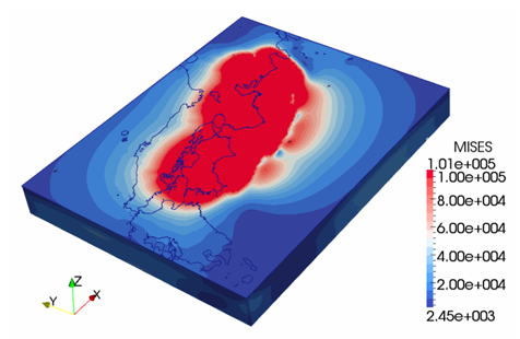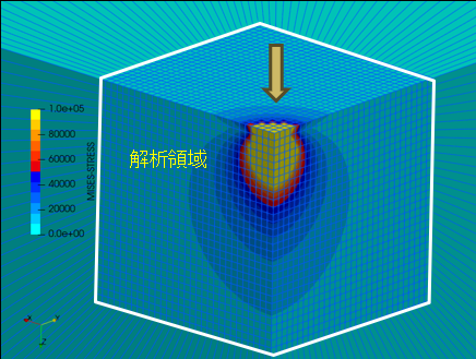 図は、想定地震による地殻変動解析の事例です。解析領域の外側に無限要素を適用しており、地盤振動や大規模構造物との連成解析において、その有効性を発揮しています。