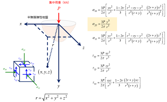 半無限地盤に集中荷重を載荷時の地中応力を解析してブシネスク理論解と比較します。