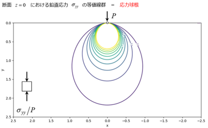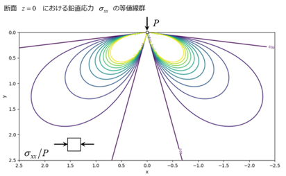 静的無限要素の検証には、ここに示すように無限地盤の1点に集中荷重がかかった場合の地中応力の分布を使いました。