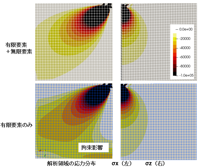 上段に無限要素を用いた応力分布、下段に有限要素のみの応力分布を示します。