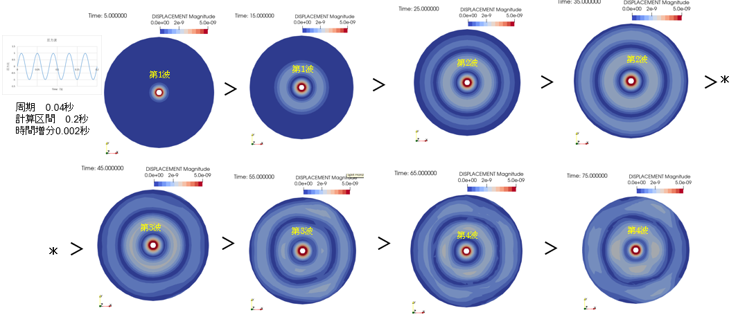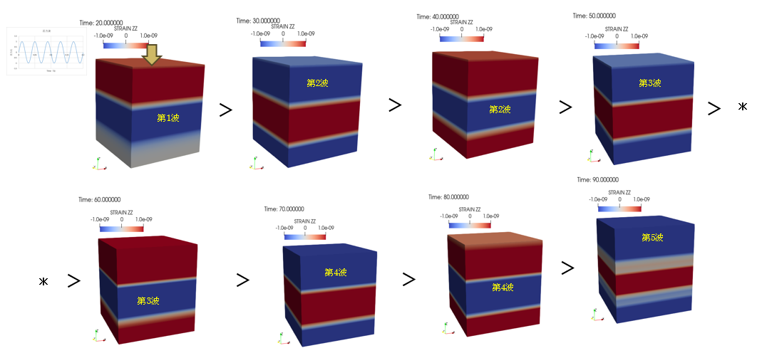 上面から連続的に圧縮波が入射する場合(下面に吸収境界)#