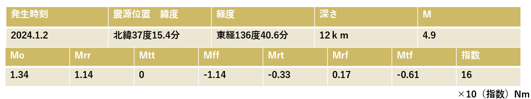 震源モーメントは 1 月 2 日の公表値です。(2024 年 1 月 2 日 4:42 能登半島沖 M4.9 )