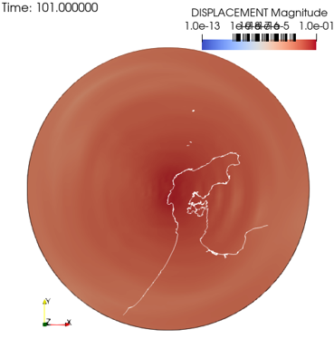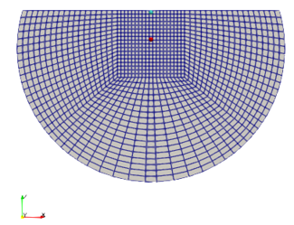 地表の高さは 0.5㎞ を仮定、座標系原点は震央における標高 0 の点におき、外側球面に吸収境界を貼付します。
