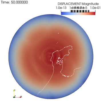 カラーコンタは変位の絶対値。黄色い矢印は変位の方向と長さを拡大して示しています。
