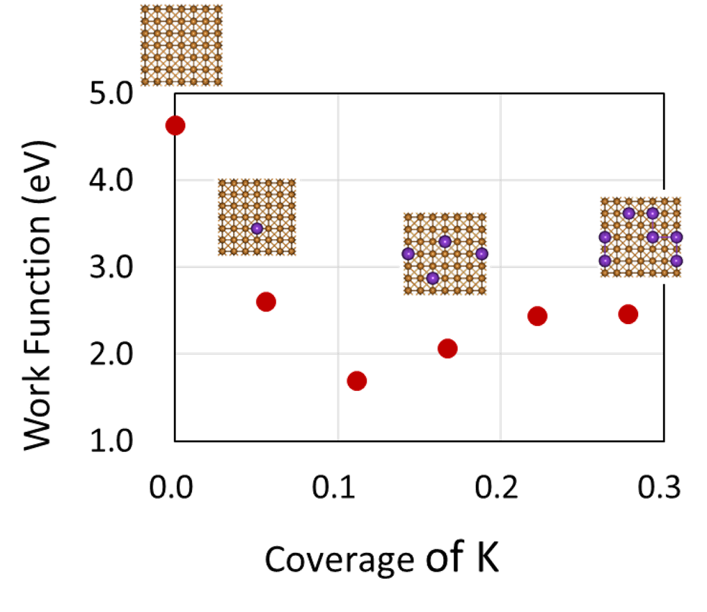 It is said that the sharp decrease of work function for low coverage is caused by surface dipole moments increased by ionized K atoms. Also, it is considered that K ions turn back into electrically natural with increasing coverage further and then the effect of the surface dipole moments is reduced4.