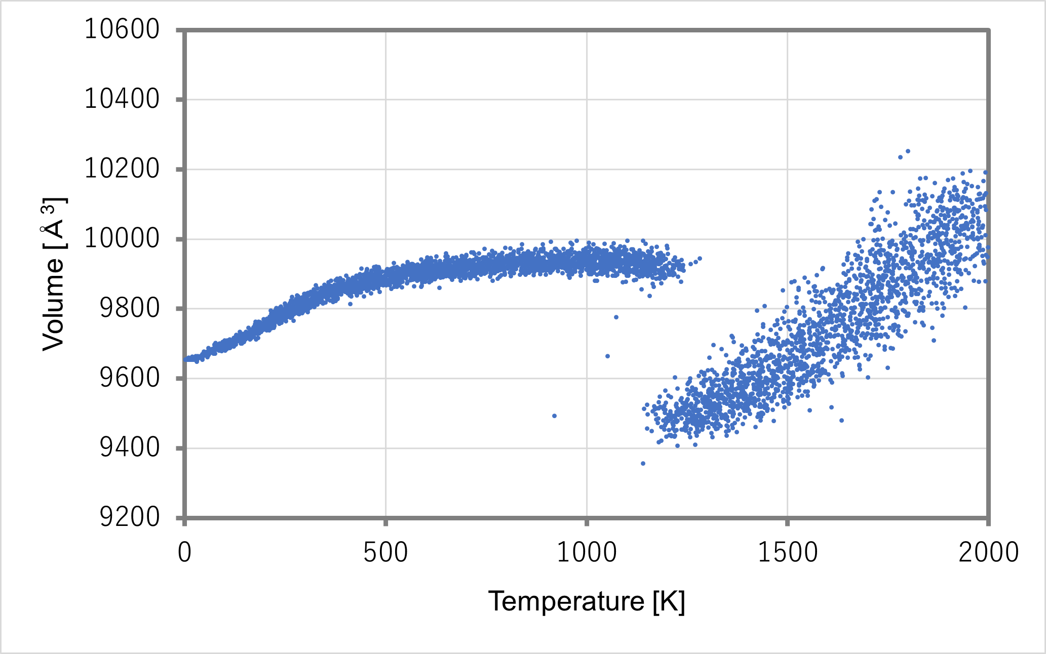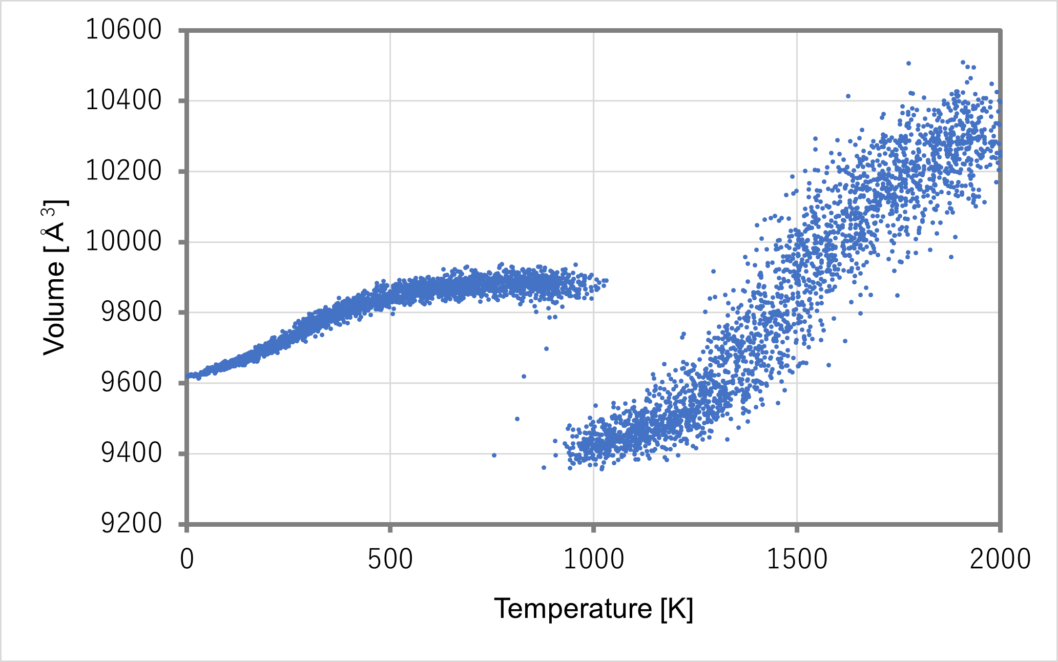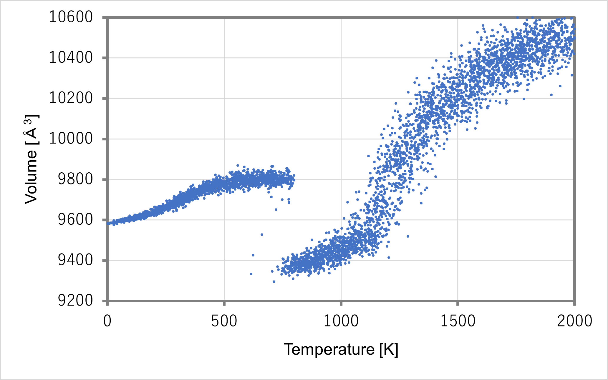 The below graph shows the volume change versus the temperature which obtained as a result of MD calculation.
