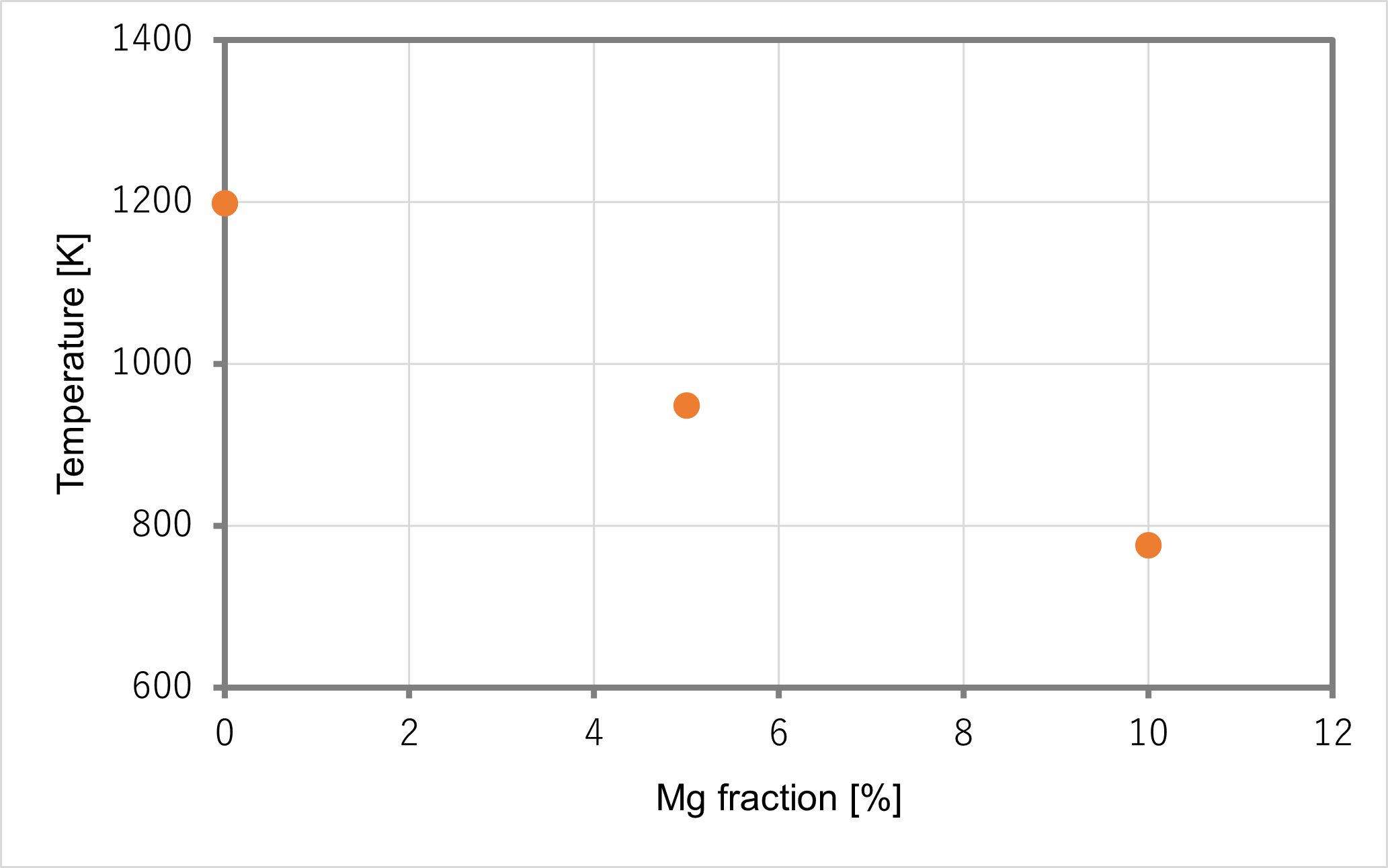 Along with the raising of Mg fraction, the temperature at which volume change occurs changed as 1198.2 K, 948.2 K and 775.4 K. According to Al-Mg phase diagram1, the melting points of them are 660 °C, 633 °C and 606 °C, so the magnitude relation of melting points can be reproduced using NNP-MD.
