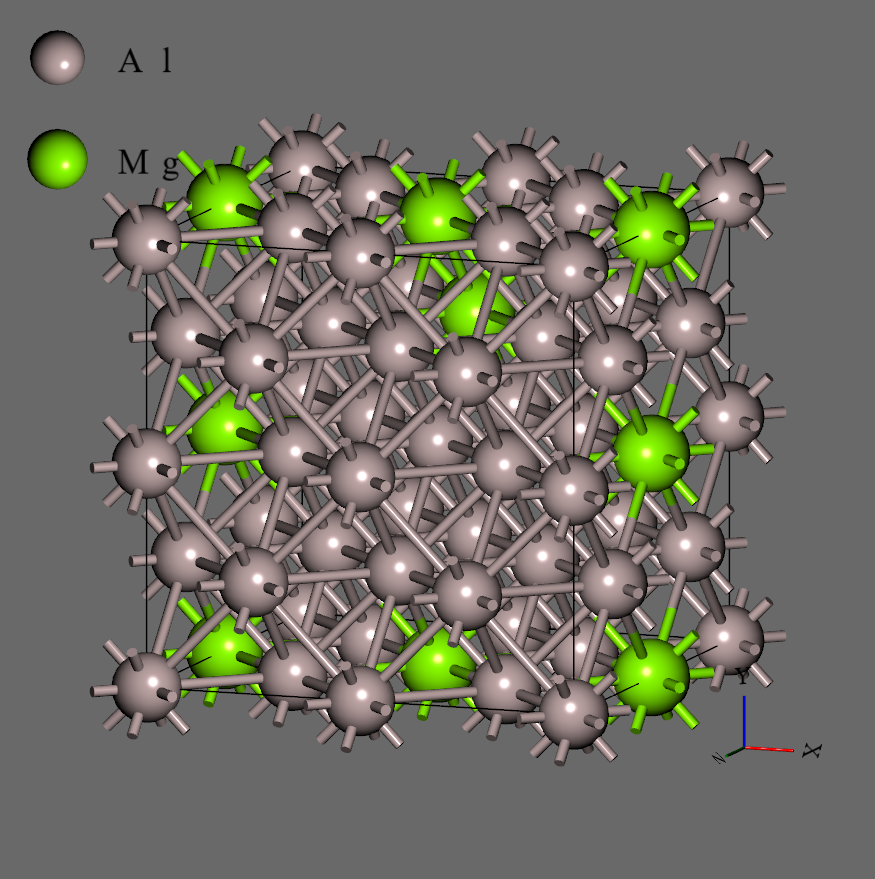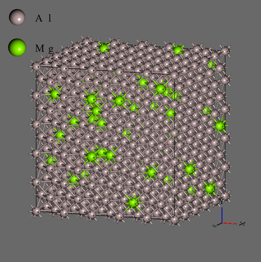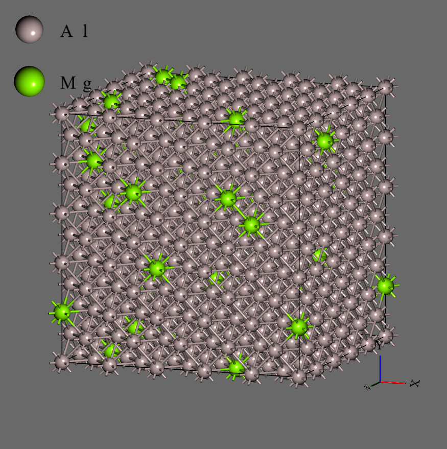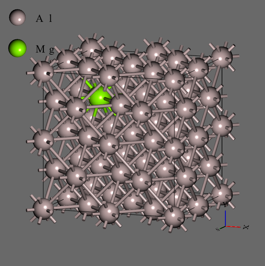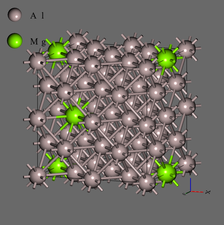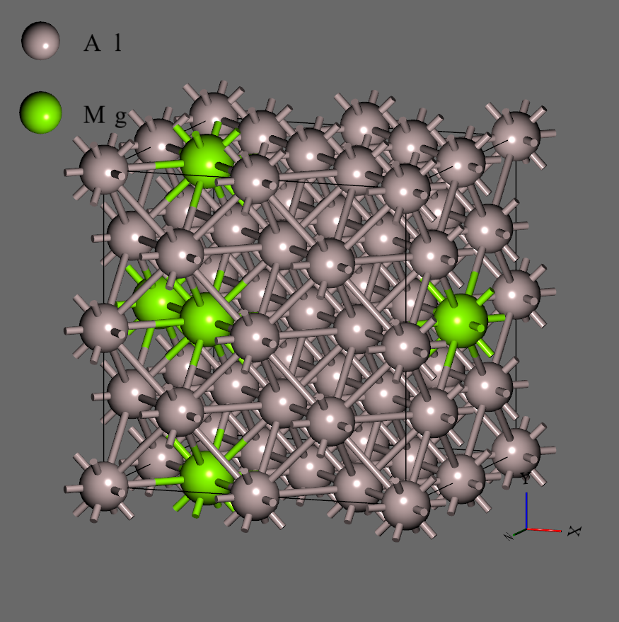 - For the initial structure, the 32 atoms system which duplicate fcc Al crystal that taken from Materials Project (mp-134) to x, y and z directions was used. In addition, the structures that 1 – 4 atoms of them were replaced to Mg were used as the initial structures too.